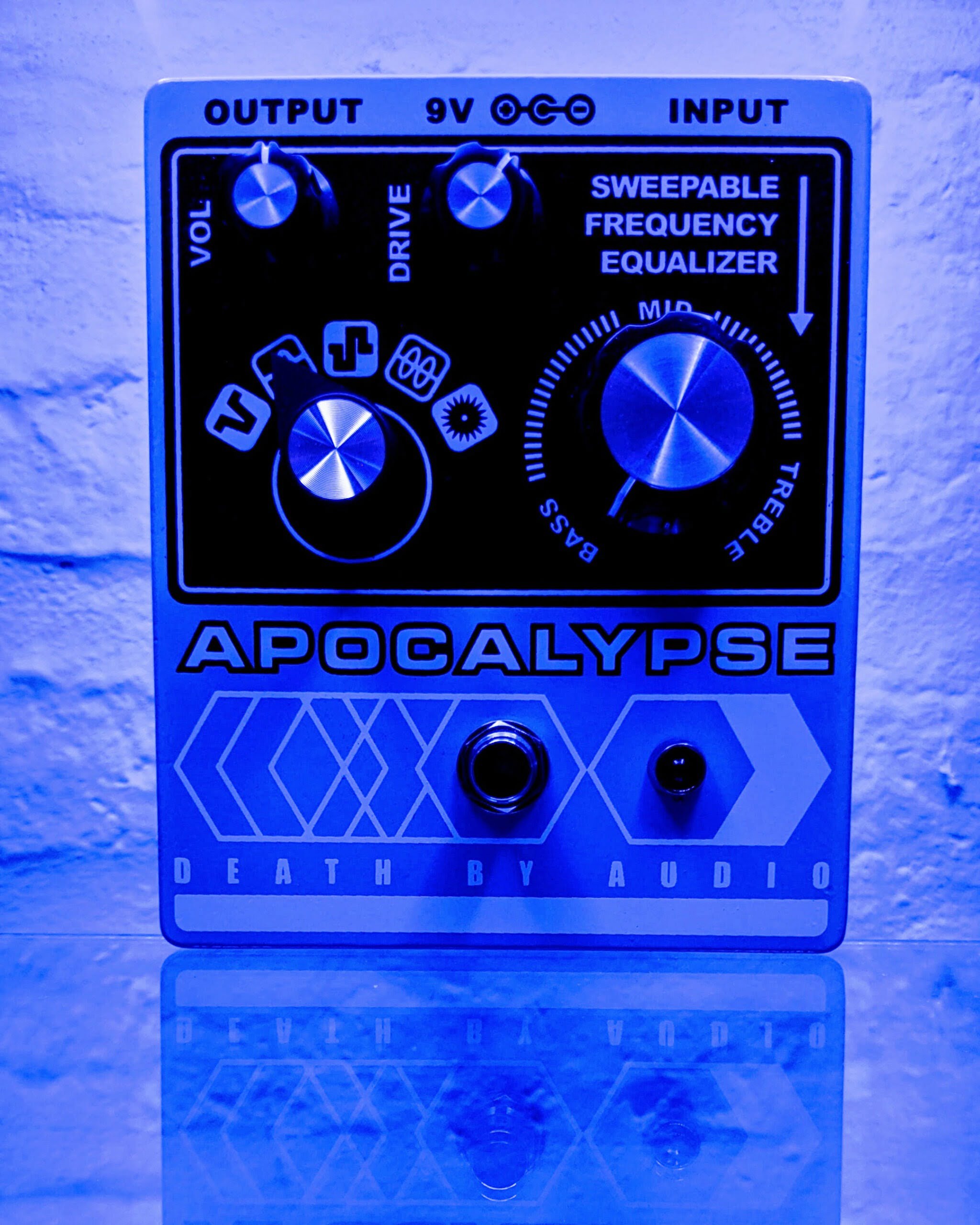 Pedal de efecto Fuzz-Overdrive con modos selectivos de post-amp. El Apocalypse es el auténtico fuzz todo terreno de DBA. Después de sobrecargar el overdrive dramáticamente la señal es ruteada a un post-amplificador selectivo. El usuario puede explorar a través de sus cinco direcciones de señal y elegir el sonido apocalíptico deseado. Y para refinar aún más, el control de ecualizador de frecuencia modificable, permite diseñar el tono según tus especificaciones.