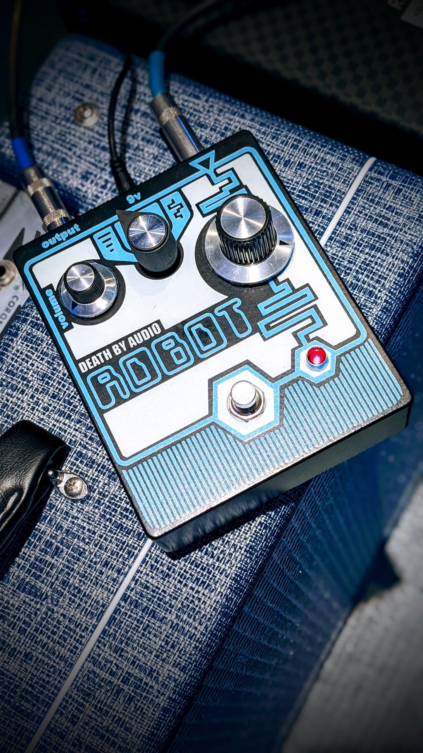 El Robot es un transpositor de tono de 8 bits de baja fidelidad sin ningún tipo de sentimiento. Es completamente sintético y transforma cualquier entrada en un puré de jerga robótica resintetizada. Un fuzz súper lo-fi flexible, octava arriba, octava abajo y arpegiador. Todos los modos están controlados por la perilla de control, que establece la frecuencia a la que opera el chip, cambiando y distorsionando los efectos de cambio de tono.