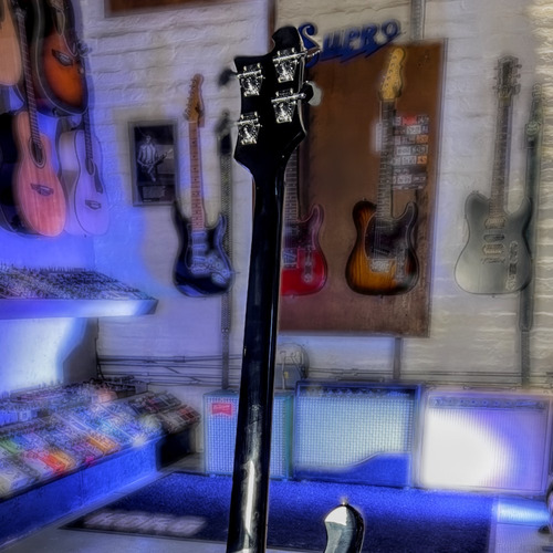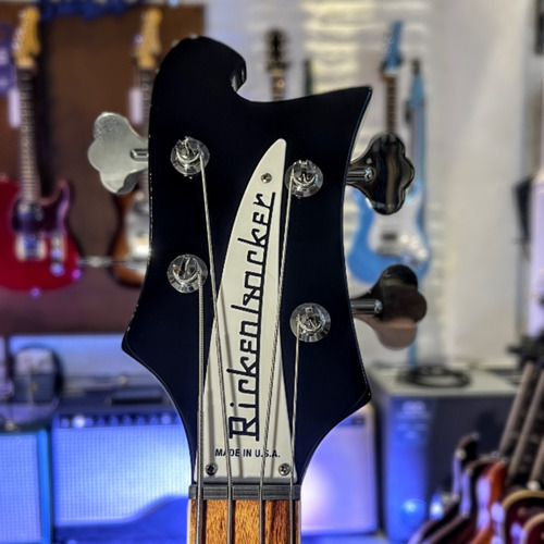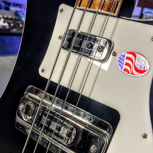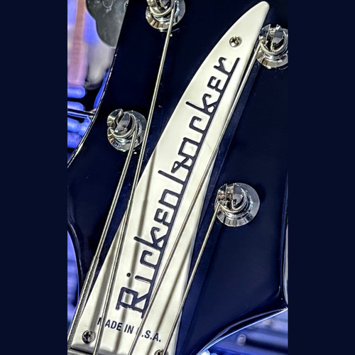 – Placa acrílica negra sobre cabezal con logo Rickenbacker y sello Made in USA
