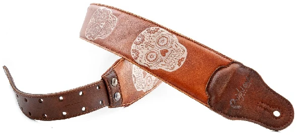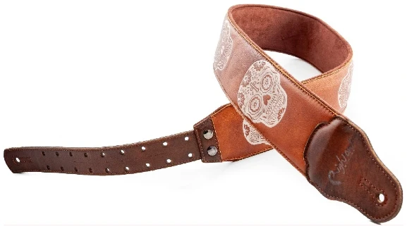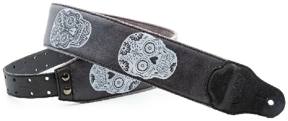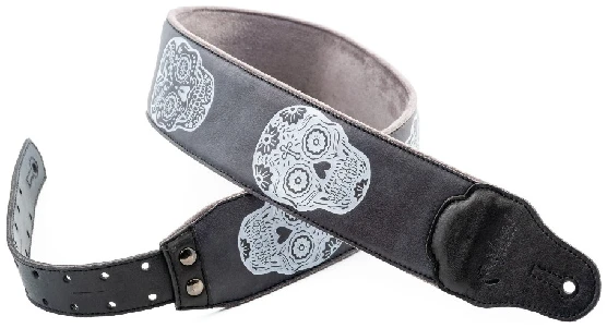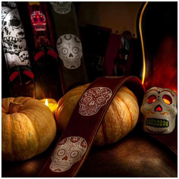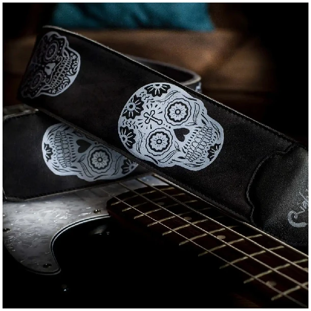 Correa de guitarra con diseño de calaveras del Día de los Muertos en color negro. Fabricada en vaquetilla de alta calidad, pintada, trabajada y envejecida a mano. Incluye grabados de calaveras de azúcar típicas mexicanas. Esta correa para guitarra y bajo cuenta con acolchado de látex de alta densidad y licra, forro de microfibra, dos porta púas integrados y sistema de ajuste RAS.