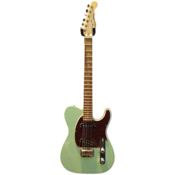 Esta pieza, única, hecha a pedido para COMPÁS UNO, es en Surf Green sobre cuerpo de Basswood, diapasón de Caribbean Rosewood, acabado de mástil brillante vintage, pickguard de 3 capas Tortoise y micrófonos en color negro.