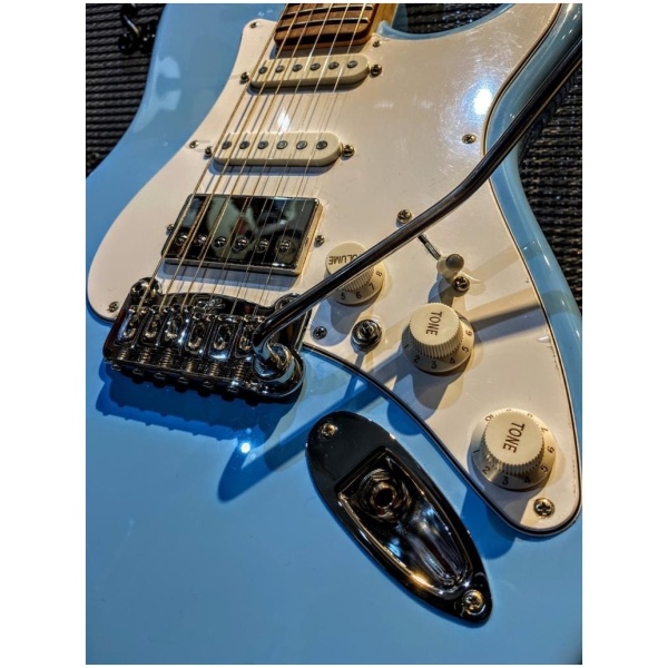 Guitarra eléctrica tipo stratocaster con humbucker de puente, pickups simple bobina y trémolo flotante de dos puntos.