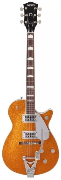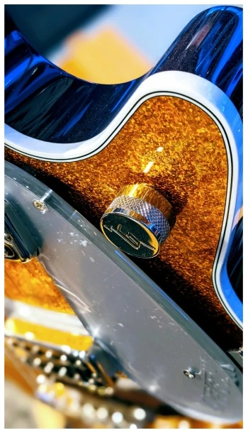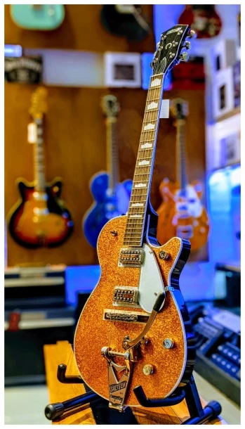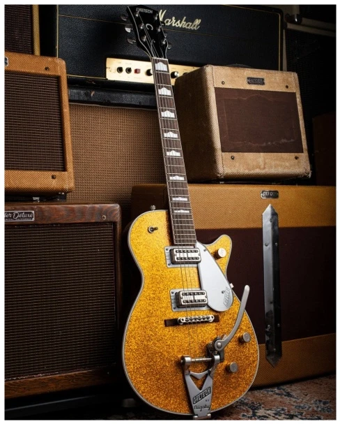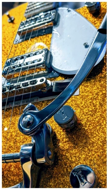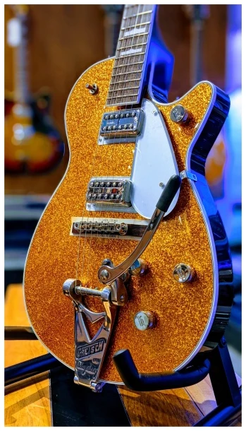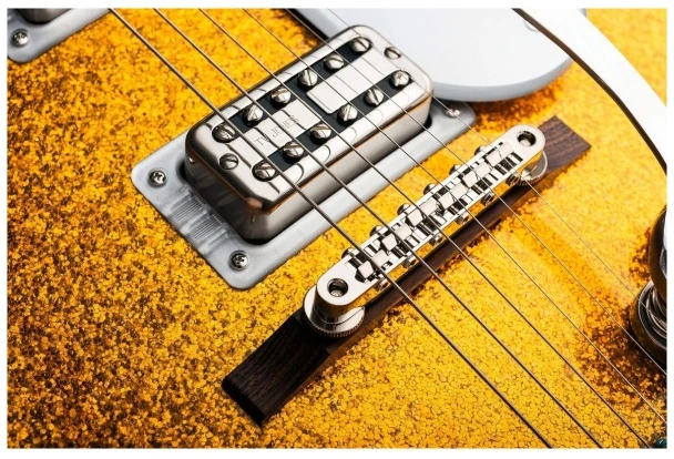Además de ser uno de los instrumentos más atractivos del planeta, el Vintage Select ’89 Sparkle Jet también es un testimonio de lo bien ordenados que están los instrumentos Gretsch modernos en comparación con los modelos pre-FMIC de la década de 1990 o los instrumentos de la era anterior a Baldwin. El clavijero negro agrandado, la incrustación de herradura y los marcadores de bloque de joroba perlados están todos presentes y son correctos, incluso se afirma que el patrón de cámara interna del cuerpo de caoba coincide con el de la época, pero los aficionados de Gretsch entre ustedes notarán instantáneamente que el puente y los pickups recibieron una actualización sustancial con la que coronar esta reedición.