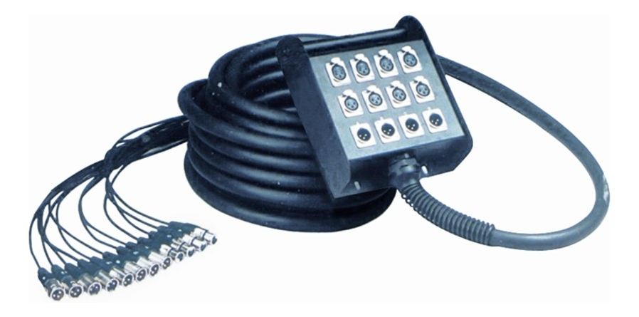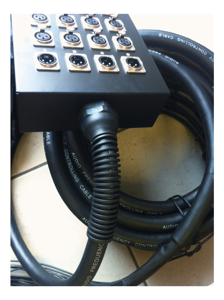 Stage Box es un dispositivo que se utiliza para recopilar señales de audio de cables separados, como los instrumentos individuales de una banda que toca en vivo, y enrutarlas a un mezclador, divisor u otro dispositivo llevándolas a través de un único cable multinúcleo que termina en un látigo. En el robusto chasis principal, se instalan conectores Cannon XLR hembra para los canales de ENTRADA y conectores Cannon XLR macho para los canales de SALIDA. Las diferentes configuraciones se distinguen por el número de entradas (IN), número de salidas (OUT) y longitud del cable multiconductor también conocido como serpiente.