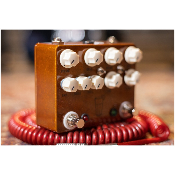 En el lado izquierdo está la versión más reciente del Angry Charlie, uno de los JHS más populares de los últimos años. El V3 incorpora el tono Brown de alta ganancia típico de JCM800, característico stacked de Marshall en su recreación más precisa para formato pedal. Posee controles dedicados de volumen y EQ de tres bandas tal como los que encontrarías en el amplificador.