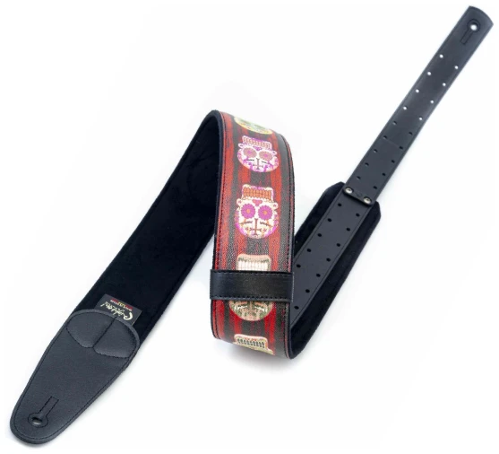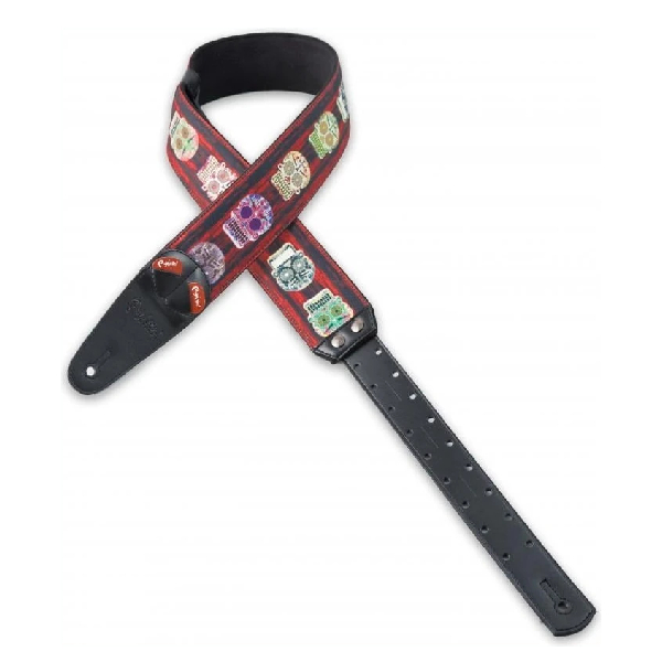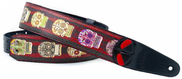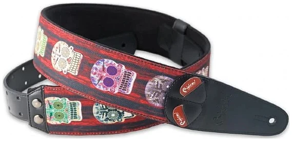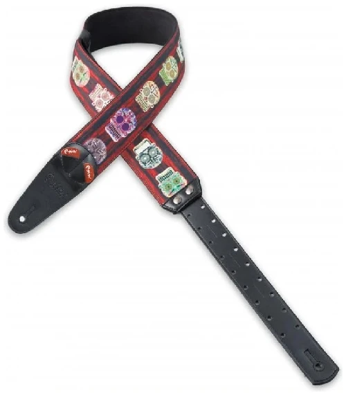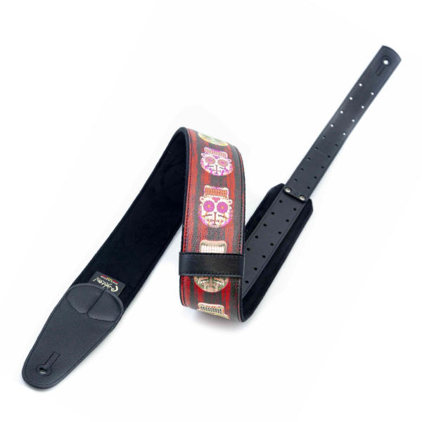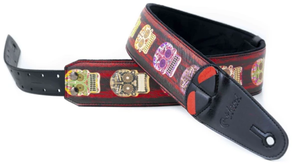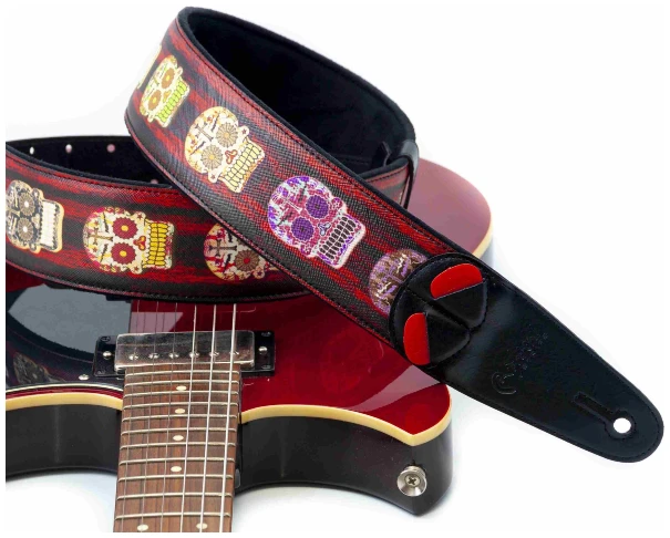 Una correa colorida. Las calaveras mexicanas están diseñadas con un montón de detalles y en diferentes colores, quedan genial con el estampado del fondo. Nos complace presentar la correa Skulls, un pequeño homenaje al Día de la Muerte mexicano y a sus calaveras de azúcar. Una llamativa correa que va a quedar genial con guitarras y bajos de colores, con camisetas coloridas y con brazos tatuados.